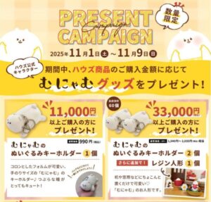 【イベント/店舗】11/1~11/9の9日間★「むにゃむグッズ」プレゼントキャンペーン実施中♪購入金額に応じて「むにゃむグッズ」をプレゼント!この冬はむにゃむに癒されよう!